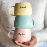 Elevate your daily ritual with our personalised Speckled Pastel Ceramic Mug, a durable and minimalist essential designed for every home. Each mug features a smooth dipped finish and natural speckle detailing, making it a thoughtful personalized gift for birthdays, teachers, or Christmas. Perfect for everything from frothy coffees and herbal teas to cozy hot chocolates and warm soups, this versatile mug brings artisanal style to every sip. When the mug is held in the right hand, the name is visible on the front. The mug is microwave and dishwasher safe. Sold individually.