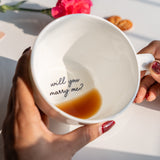 Turn a quiet morning coffee into the moment that changes your lives forever. Our hidden message proposal mug is designed for the ultimate surprise. At first, it looks like a beautiful, personalized ceramic cup, but as they finish their drink, the life-changing question "Will You Marry Me?" is revealed at the bottom. Perfect for a cozy breakfast in bed or a "casual" coffee date that turns into a celebration. When the mug is held in the right hand, the name is visible on the front. The mug is microwave safe. Made in India. Sold individually.