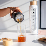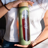 Stay hydrated in style with our water bottle with built-in strainer and silicone sleeve. The non-slip, heat-resistant silicone sleeve ensures a secure grip, protects your hands while sipping hot beverages, and adds an extra layer of durability. It also acts as a cushion against accidental drops or bumps. Featuring time markers to track daily hydration and a convenient lanyard on the lid, this bottle is perfect for infused water, tea, or everyday use at home, work, or on the go. The built-in strainer allows you to enjoy fruit-infused water or herbs without residue. Sold individually.