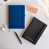 This stylish hardbound A5 personalized notebook in black is the perfect accessory for your desk or stationery collection. The elastic band enclosure helps keep the pages secure. Use this notebook as a daily journal or diary, as a planner or just to doodle your ideas. Personalise it with your initials or name and make sure it never gets mixed up again. Makes for a thoughtful gift for your friends and family.  Contains 78 pages approx. Sold Individually.